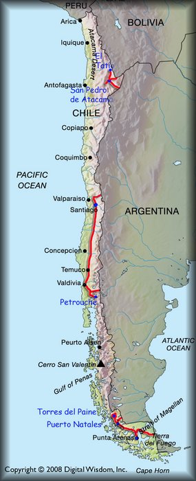Po kilku tygodniach jestem ponownie w Chile, w najbardziej suchym miejscu świata – na pustyni Atacama. Ciekawe jest samo miasteczko San Pedro de Atacama (m.in. kościół San Pedro, małe uliczki z niskimi domkami) oraz jego okolica (m.in. Pukara de Quitor – pozostałość po forcie na zboczu góry, inkaskie ruiny Catorpe, Diabelski Wąwóz, Laguna Chaxa itp.), na której zwiedzenie chyba najlepszym rozwiązaniem jest wypożyczenie roweru. Godne polecenia są również nieco dalsze wycieczki.